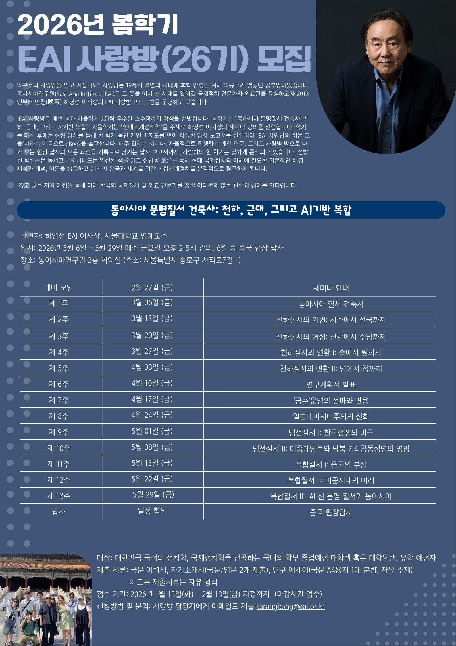2026년 봄학기 EAI(동아시아연구원) 사랑방 26기를 모집합니다.